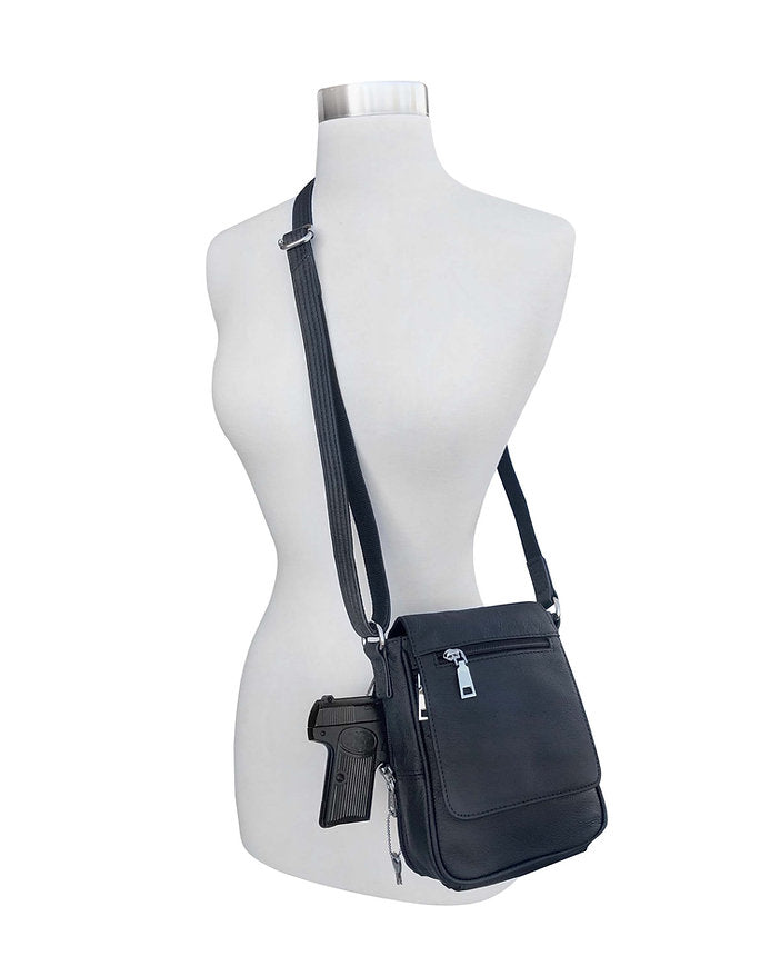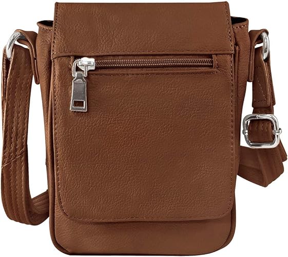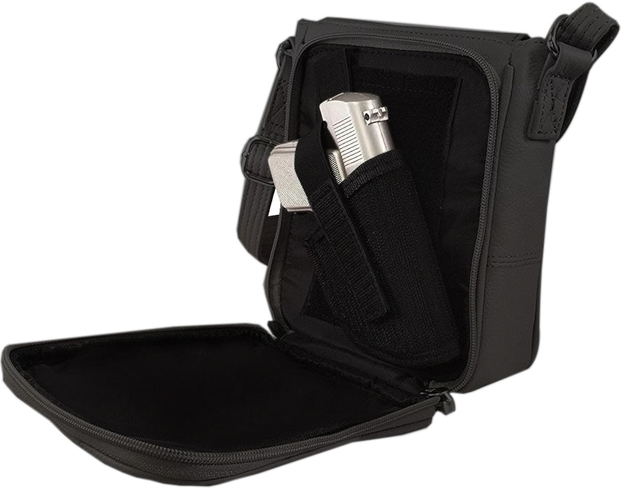LEATHER MADE - Manufactured to precision with the finest pieces of cowhide leather known to offer maximum value for texture, durability, and comfort. Its leather material is carefully selected to resist dirt and water, making it easy to clean and maintain.SPACIOUS COMPARTMENT - Get optimized space with this bag that comes with a spacious main compartment designed with leather over the flap. Its compartment allows you to keep your things secured without any worries.FUNCTIONAL STRUCTURE - The flap of this bag features a zippered pocket on the front side. It also has a throw pocket giving you additional space for storing your mobile devices.GUN CONCEALMENT - Carry your protection and be as secure and safe as possible! The back side of this bag is the gun concealment pocket designed with an adjustable Velcro holster. This bag fits KAHR 380, KAHR P9, Ruger LCP, and all guns of similar size.COMPACT DESIGN - This bag measures 8 x 6 x 3 inches and is designed with a body strap. Its compact design makes it easy to carry wherever you go at any time of the day.