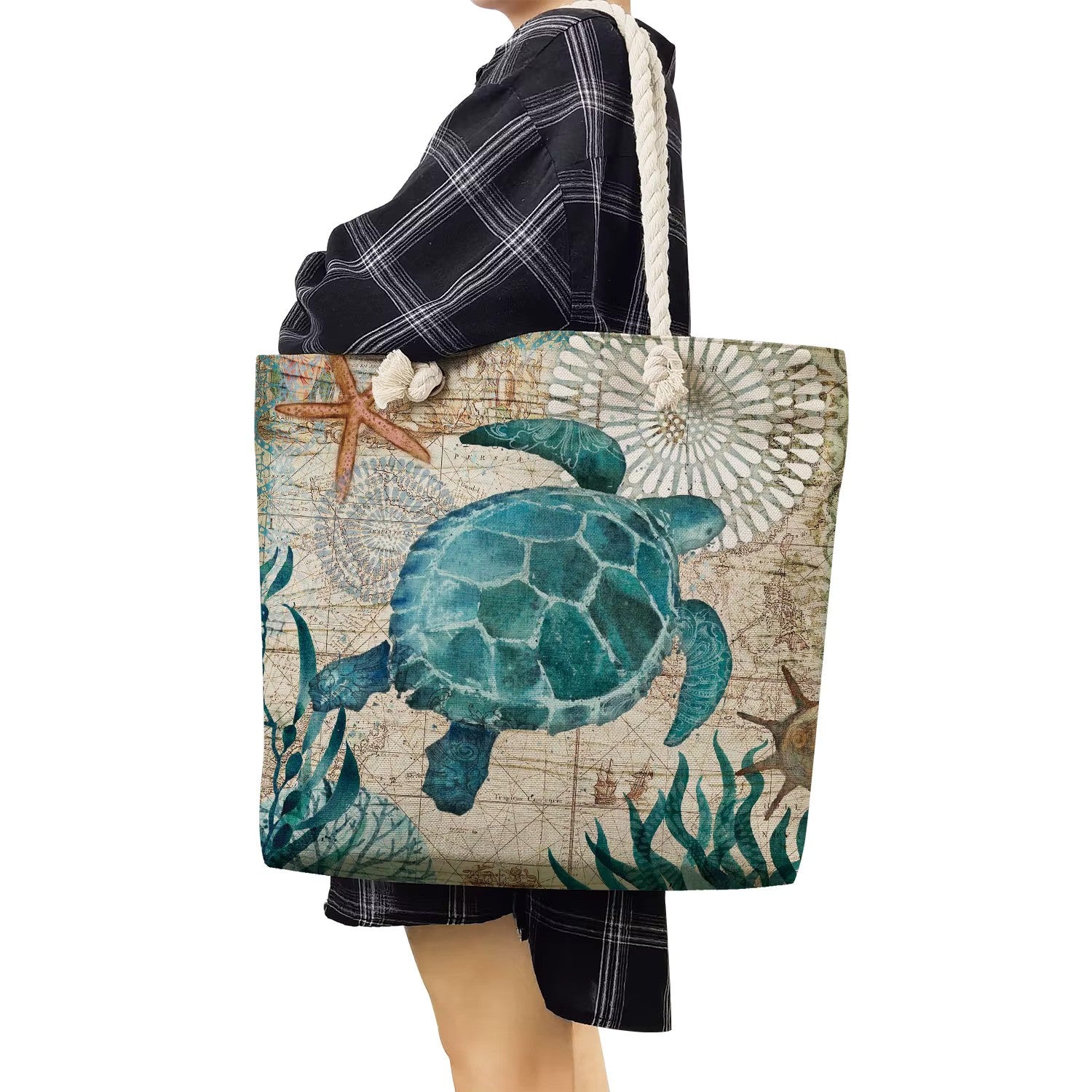 Sea Turtle Beach Tote Bag - Nautical Ocean Print with Rope Handles